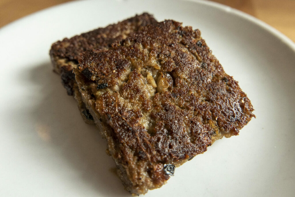 Are you looking for an unusual, but delicious recipe for your holiday breakfast? Look no further. It’s my pleasure to introduce you to an old family recipe: Scrapple. I grew up in Missouri and always thought scrapple was a southern thing, however, when researching, I found it is actually an old German recipe from the Philadelphia region. It was usually made after hog butchering and used left over meat and broth. Since hog butchering isn’t that common these days, this recipe uses ground pork and beef. As I stated before, this recipe is old, and measurements aren’t quite what we are used to. I will put it here as written and add notes to help you along.
